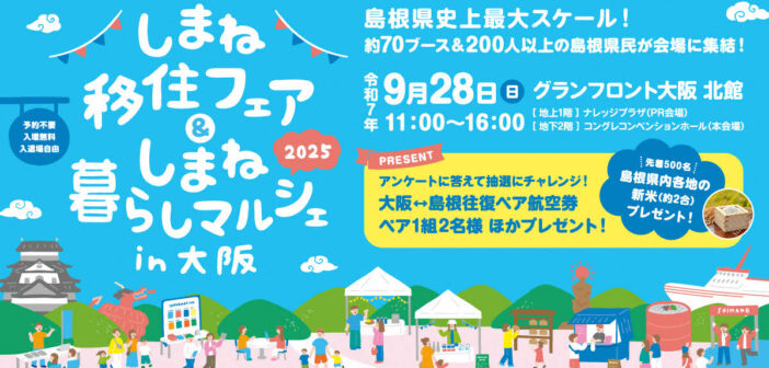 島根県内の自治体や就職支援団体などが集結し、参加者の移住相談に乗る「しまね移住フェア」が9月28日、大阪市内で開催されます。今回は特産品の販売などを行う「しまね暮らしマルシェ」との併催で、出展ブースは県最大規模の約70ブースに上り、総勢200人以上の県民が集まるそうです。島根の魅力をたっぷり味わえる貴重なイベントになりそうです。