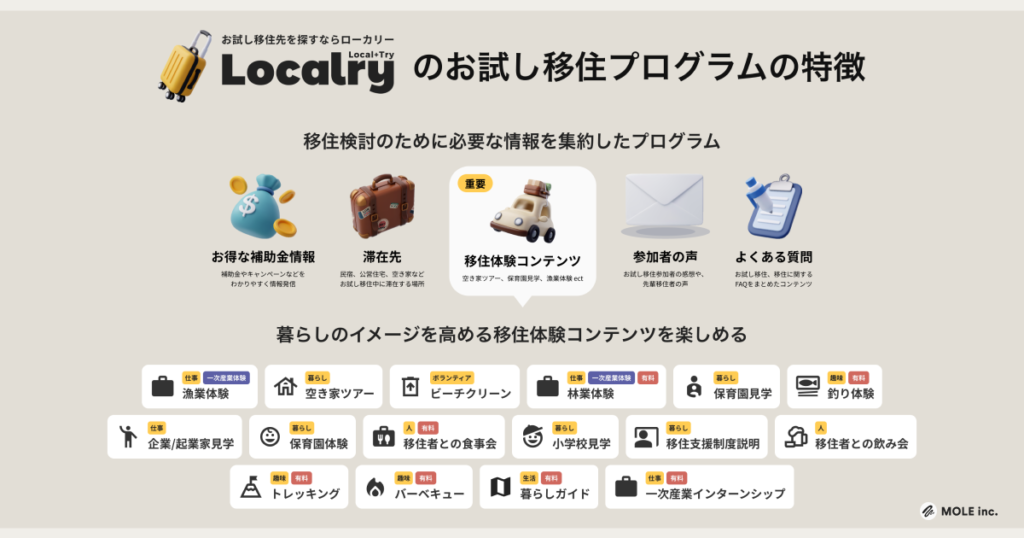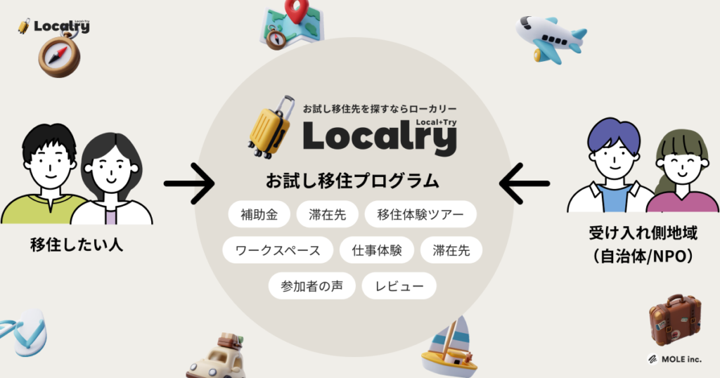 WEBアプリケーション開発などを手がける株式会社MOLE(本社:東京渋谷区)がこのほど、全国のお試し移住プログラムを掲載した「Localry(ローカリー)」をリリースしました。各地のお試し移住に関する情報を網羅したプラットフォームとして今後、掲載地域やプログラムを拡大していく予定です。